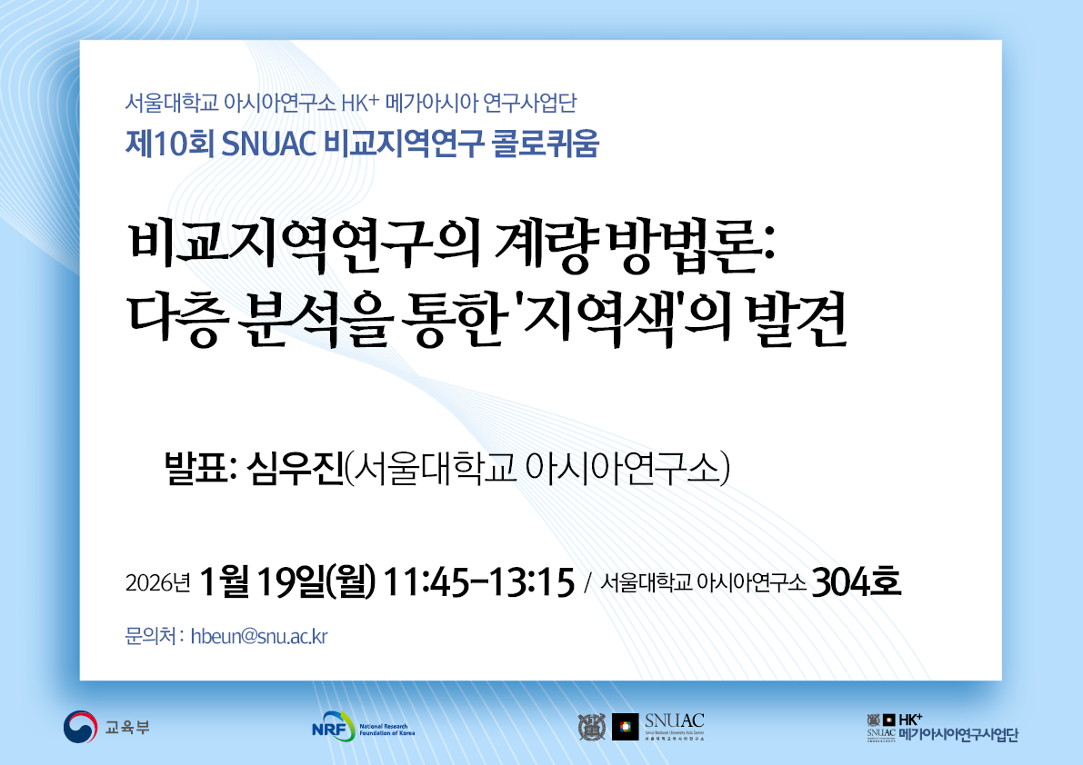 Calendar View | List View All Speakers | Test test test test Test test test test Test test test test Test test test test Test test test test Test test test test All Location Test test test test Test test test test Test test test test Test test test test Test test test test Test test test test 전문직 이주자의 자리에서 본 다문화 한국 사회일시: 2026년 2월 26일(목) 14:00-15:30 줌 링크: https://forms.gle/bwGGGvjAUXpPtELk7 DETAIL > 지속가능한 산악 발전: 키르기스 공화국의 산악 지역 이니셔티브와 글로벌 협력일시: 2026년 2월 13일(금) 15:30 ~ 16:30 장소: 서울대학교 아시아연구소 303호 DETAIL > 9세기 신라 대외교섭에서 전통의 재발견과 그 의의 -紀三津 방환을 둘러싼 논의를 중심으로-일시: 2026년 2월 12일(목) 16:00-18:00 장소: 서울대학교 아시아연구소 304호 DETAIL > 이동하는 청년, 재구성되는 공간 – 한중 청년 모빌리티의 새로운 양상일시: 2026년 2월 6일(금) 9:00-12:00 장소: 항저우창업발전촉진회(중국 항저우시) DETAIL > 동아시아 청년 모빌리티와 창업 생태계일시: 2026년 2월 5일(목) 15:00-17:00 장소: 중국 푸단대학 이우연구원 DETAIL > 『한국대중문화사』(김창남) 영문판 출간 기념 세미나일시: 2026년 2월 4일(수) 14:00-17:30 장소: 서울대학교 아시아연구소 영원홀(210) DETAIL > 북극항로 개척과 당면과제일시: 2026년 2월 3일(화) 10:00 ~ 12:00 장소: 서울대학교 아시아연구소 303호 Zoom Link: https://snu-ac-kr.zoom.us/j/81005238589 DETAIL > 한국과 일본의 청년 모빌리티와 사회·공간 변동일시: 2026년 1월 23일(금) 13:30~17:30 장소: 서울대학교 국제대학원 GL룸 DETAIL > 비교지역연구의 계량 방법론: 다층 분석을 통한 ‘지역색’의 발견일시: 2026년 1월 19일(월) 11:45-13:15 장소: 서울대학교 아시아연구소 304호 DETAIL > 2025 아시아연구소 석·박사학위논문상 시상식일시: 2026년 1월 19일(월) 11:00 -14:00 장소: 서울대학교 아시아연구소 국제회의실 303호 DETAIL >