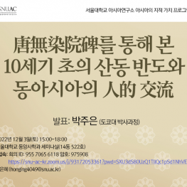 2022년 12월 3일 오후 3시, ‘아시아의 지적가치 프로그램’ 주최 특별강연 “唐無染院碑를 통해 본 10세기 초의 산동 반도와 동아시아의 人的 交流”이 열렸다. 8세기 중엽에 세워진 장보고 세력의 거점이었던 적산법화원이 회창 폐불로 인해 파괴된 이후, 산동 반도를 중심으로 한 동아시아의 교류에 대해서는 단편적인 사료만 존재하여 그 양상을 알기 어려운 점이 많았다. 하지만 당무염원비(唐無染院碑)는 선종 사원의 석비로, 회창 폐불 이후 새롭게 산동 반도에 세워진 것이다. 따라서 폐불 이후의 산동 반도의 모습을 알 수 있는 사료임과 동시에, 비석문에 신라인과 함께 절강 지역 사람들이 등장함에 따라 당시의 동아시아 인적 교류에 대해 새로운 정보를 제공해 주는 사료이다. 본 발표에서는 이러한 사료를 통해 901년에 당무염원비가 산동반도에 세워진 의의에 대해 밝혀보고자 하였다.