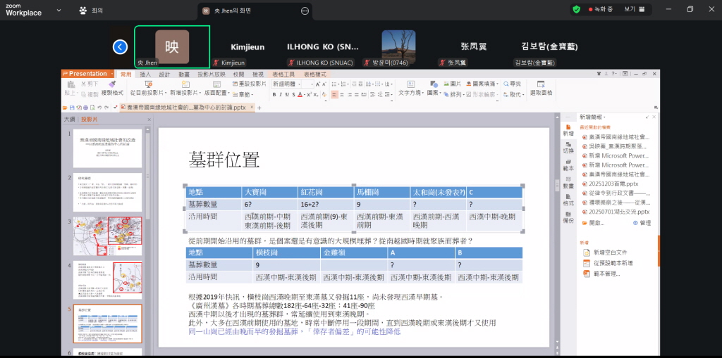 2025년 12월 11일, 오전 10시~12시에 남경대학교 및 중흥대학교에서 박사과정에 재학 중인 오영진(吳映蓁)의 <秦漢帝國南緣地域社會的改造──以番禺地區漢墓爲中心的討論>라는 제목으로 발표를 진행하였다.