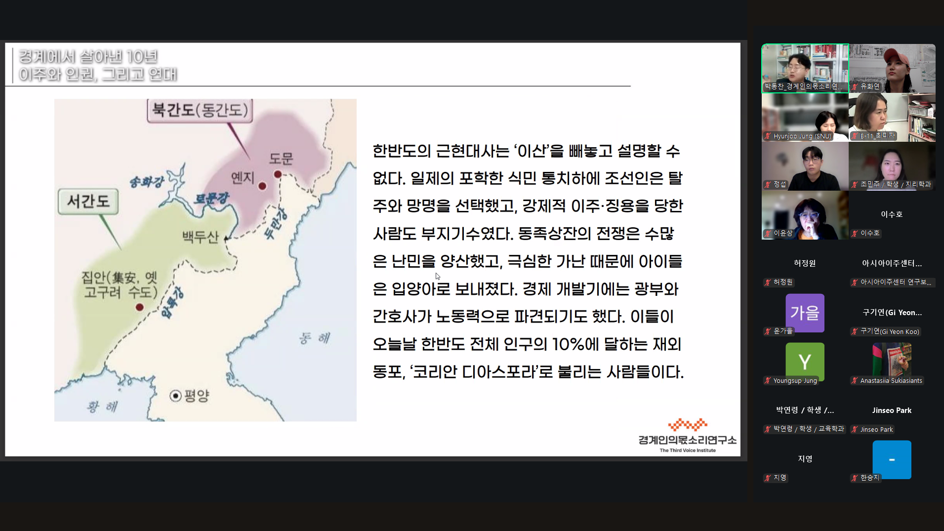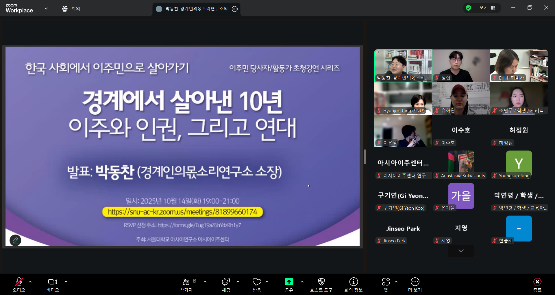 2025년 10월 14일 아시아연구소에서는 ‘경계에서 살아낸 10년: 이주와 인권, 그리고 연대’라는 제목으로, 경계인의몫소리연구소 박동찬 소장의 강연이 있었다. 비영리단체 ‘경계인의몫소리연구소’의 소장을 역임 중인 박동찬은 중국 선양에서 태어나, 서울살이를 10년째 진행 중인 이주 당사자이자, 연구 활동가이다. 현재 대학원에서 사회학을 공부함과 동시에, 현장에서 이주인권 이슈의 공론화와 이주노동자 조력 활동을 하고 있다. 세부 연구 주제는 이주 노동자(재중동포)와 인권으로, 특히 최근에는 재중동포의 이주노동 인권 문제를 다루고 있다. 또한, 아리셀 중대재해 참사 이주노동자 유가족의 통역을 전담하였고, 최근에는 혐오의 주류화에 맞서 대항 담론, 대항 주체의 형성을 도모하고 있다. 현재 그는 국내 대표적 이주민 밀집 지역인 대림동을 안내하고 있고, 제5회 ‘이주노동자희망상’을 수상하였다.