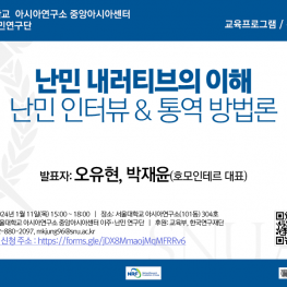 연구단은 호모인테르 오유현 대표님, 박재윤 대표님을 모시고 2회에 걸쳐 워크숍을 진행합니다. 호모인테르는 “누구도 배제되지 않는 소통”을 위하여 상호문화철학과 심리정서적 측면을 통합한 공공서비스 통역 트레이닝을 제공해왔습니다. 우리의 말과 행동이 서로 통하고 우리가 연결될 수 있다면 “서로의 문화를 존중하고 다름이 풍요가 되는 사회”로 한 발짝 다가갈 수 있을 것입니다. 첫 번째 워크숍의 주제는 “난민 내러티브의 이해: 난민 인터뷰 & 통역 방법론”이고, 두 번째 주제는 “트라우마 현장에서 연구하기: 연구참여자와 연구자 보호”입니다. 이 교육 프로그램은 서울대 구성원과 일반인들에게 열려있습니다. 이번 워크샵은 정원 15명 사전신청으로 진행합니다. 참고 부탁드립니다. 관심있는 분들의 많은 참여 바랍니다.
