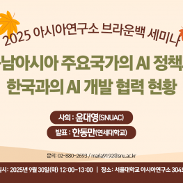 9월 30일(화) 서울대학교 아시아연구소에서 열린 브라운백 세미나 “동남아시아 주요 국가의 AI 정책과 한국과의 AI 협력과제”에서는 동남아시아 AI 산업의 현황과 전망, 그리고 한국과의 협력 방향이 논의되었다. 발표에서는 싱가포르, 인도네시아, 베트남이 국가 정책을 바탕으로 AI 산업을 적극적으로 육성하고 있음을 강조하며, 저렴한 물가와 젊은 인구 구조가 동남아시아의 중요한 경쟁력이 될 수 있다는 분석이 제시되었다.