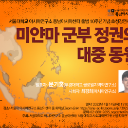 이 강연은 미얀마 군부의 대중적 지지기반 확보를 위한 대중 동원이라는 관점에 주목한다. “미얀마 군부 정권의 대중동원 매커니즘”이라는 제목으로 게재된 논문에 기반해 땃마도의 친정부조직 형성과 동원 과정에 대해서 살펴보고자 한다. 이를 통해 권위주의 정부의 대중동원은 어떤 형태와 목적으로 이뤄지는지, 이러한 조직적 활동이 권위주의 정권의 권력 강화에 어떠한 영향을 미쳤는지 살펴보고자 한다. 특히, 1988년 이후 미얀마에서 군사정권이 대중동원을 위해 조직한 연방단결발전위원회(Union Solidarity and Development, Association, USDA)에 주목한다. 군사정권은 1993년에 설립된 정부 후원 조직인 USDA를 통해 대중 동원력을 달성했다고 볼 수 있다. 설립함으로써 동원력을 달성했다. 규율 민주주의(Discipline-flourishing democracy)로의 체제 전환을 위해 대중동원 역량이 필요했던 것이다. 실제로 신헌법 제정을 위한 전국대회 소집, 반전복법, 민주화 7단계 로드맵 등 정권의 정책을 지지하는 주제로 전국에서 여러 차례 친정부 대중집회를 열었다. 이후 USDA는 헌법 제정 과정에 대표로 합류했다. 나아가 2010년 총선을 앞두고 후원단체에서 정당인 USDP(Union Solidarity and Development Party)로 탈바꿈했고 이런 의미에서 군부정권에 의한 대규모 동원은 탈권위주의 사회에서 땃마도에게 안정적 환경을 제공하는데 기여했다.