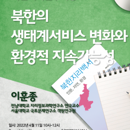 4월 11일 여섯 번째 북한지역연구특강은 ‘북한의 생태계서비스 변화와 환경적 지속가능성’이라는 주제로 북한의 전반적인 환경문제에 대해 파악하고 토론하는 시간을 가졌다. 생태계서비스는 ‘생태계와 생물종이 지속하고 인간생활을 영위하게 하는 상태와 그 과정’으로, 이 서비스 체계가 지속 가능하도록 사회적으로 노력해야 한다. 북한의 환경 문제는 북한만의 문제가 아닌 한반도가 공동으로 지닌 문제이므로 함께 협력하여 개선해나가야 한다. 하지만 북한에서는 생태계서비스 뿐만 아니라 산림 황폐화 문제에 둔감하여 지속가능한 환경 관리를 이루지 못하고 있다. 현재까지 우리나라에서 다양한 북한 관련 환경문제 연구, 정책 등을 논하고 있지만 실효성 있는 환경 평가와 개선을 위해서는 함께 생태계 서비스 가치평가 연구, 다양한 공간자료 DB 구축, 협의 등이 필요하다는 것을 강조하며 특강을 마무리 하였다.