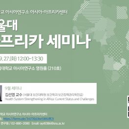 서울대학교 아시아연구소 영원홀(210호)2022년에 서울대 아시아연구소 아시아-아프리카센터에서 정기적으로 진행하는 <서울대 아프리카 세미나> 시리즈의 9월 세미나에 김선영 서울대학교 보건학과 교수를 초청해 <Health System Strengthening in Africa: Current Status and Challenges>라는 주제로 강연을 진행하여 아프리카 지역에서의 보건 분야 거버넌스의 현황과 어려움에 대해 알리고자 함.