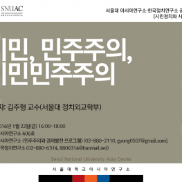 서울대 아시아연구소.한국정치연구소 공동콜로키움 [시민정치와 시민민주주의] Speakers 김주형 교수 서울대 정치외교학부 Start 2016년 1월 22일 - 4:00 pm End 2016년 1월 22일 - 8:00 pm Address 아시아연구소 406호 Categories 민주주의와 경제발전 프로그램 , 콜로키움 서울대 아시아연구소.한국정치연구소 공동콜로키움 [시민정치와 시민민주주의] + GOOGLE CALENDAR + ICAL IMPORT MORE DETAIL Website http://snuac.snu.ac.kr/demeconc/ Phone 880-2110 Email gyong0507@gmail.com Related Events ‘비지니스맨이 바라본 미얀마의 정치와 경제’ 2014년 2월 17일 4:00 pm ‘아랍의 봄’ 이후 혁명과 반혁명 2018년 4월 12일 12:00 am