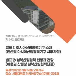 지난 3월 16일 열린 아시아도시사회센터 제 24회 콜로키움에서는, ‘아시아산림협력기구(AFoCO) 현황’ 및 ‘남북산림협력의 현황과 전망’에 대한 발표와 토론이 진행되었다.