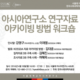아시아연구소 내 각 연구단위에서 생산되는 연구 원자료들이 영구적으로 보존되고 재활용될 수 있도록 한국사회과학자료원(KOSSDA)의 아카이빙 절차와 방법에 대해 워크숍을 통해 안내하고 협조를 요청코자 합니다.