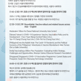 영어로 진행될 2부는 필리핀, 싱가포르, 인도, 대만의 현지 연구자들이 각국의 백신접종 관련 현황을 이야기하고 라운드 테이블 토론을 할 예정입니다. 3부는 국제보건의료협력을 모색하는 자리로 백신의 정치화에 대하여 김재형 한국방송통신대학교 교수의 발표가 있고, 다음으로 팬데믹 시기 글로벌 보건거버넌스: 중국의 백신외교’라는 제목으로 서정경 아시아연구소 객원연구원의 발표가 이어집니다. 마지막으로 한국보건의료재단의 김순애박사가 “국제보건의료협력을 위한 방안”에 대하여 발표해 주실 예정입니다.