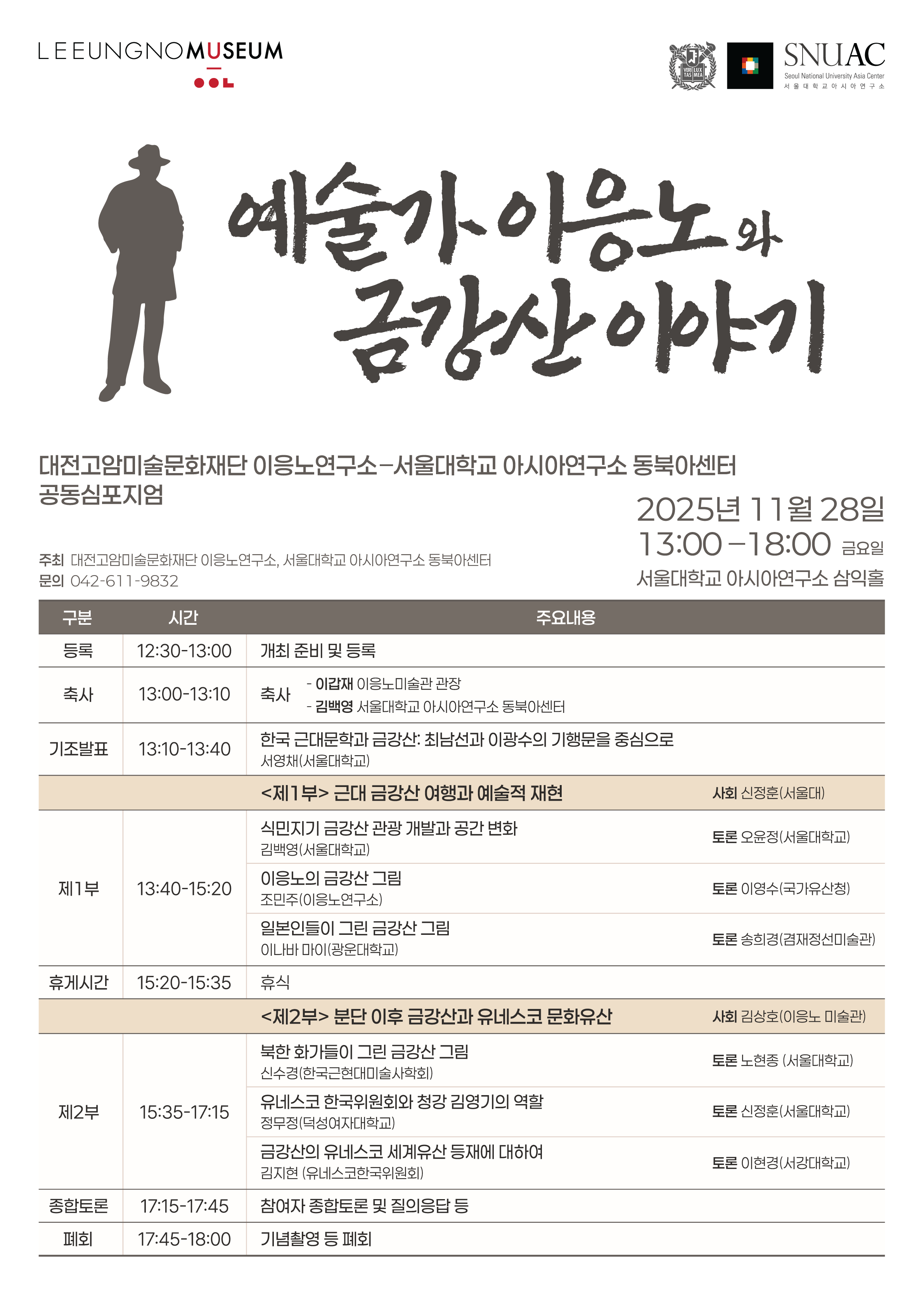 2025년 11월 28일(금) 13:00-18:00, 서울대학교 아시아연구소 삼익홀에서 이응노미술관과 아시아연구소 동북아시아센터 공동 주최로 <예술가 이응노와 금강산 이야기> 심포지엄이 개최된다.