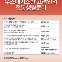 서울대학교 아시아연구소 중앙아시아센터에서는 중앙아시아 고려인의 전통생활문화 DB 자료를 구축하는 사업을 진행 중이다. 이번 콜로키움에서는 2차년도 우즈베키스탄 지역 고려인에 대한 현지조사의 결과를 일상, 의례, 예술, 전지구화 등 다양한 주제들로 나누어 살펴본다.