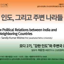 서울대 아시아연구소 남아시아센터는 “인도, 그리고 주변 나라들”을 주제로 지역심화세미나를 개최하였다. 본 강연은 인도와 주변 국가들과의 국제 관계 및 정치·경제 관계를 조망함으로써 인도와 주변 나라들과의 신지정학적 및 신지경학적 관계를 살펴보는 시간이었다. 인도 지역 전문가 2인의 특별 강연으로, “New Political Relations between India and its Neighbouring Countries(1부)”와 “모디 2기, “강한 인도”와 주변국 관계(2부)“로 나누어 진행되었다.