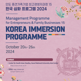서울대 아시아연구소의 남아시아센터에서는 2022년부터인도 IIMB와 MoU를 맺어 공동으로 한국 심화프로그램(Korea Immersion Programme, KIP)을 개최해왔으며, 올해 3회차의 프로그램을 성공적으로 개최하였습니다. 벵갈루루에 소재한 IIMB에서 수행하는 가족기업 경영인 최고경영자과정(Management Programme for Entrepreneurs and Family Businesses, MPEFB)은 인도의 전통적인 가족기업들이 맞이하고 있는 새로운 시대에 대한 대응 능력을 함양하기 위해 마련된 최고경영자 프로그램입니다. 인도 사기업의 중추를 이루는 가족기업들이 세대가 교체되는 상황에서도 가족기업이 미래지향적인 경쟁력을 확보할 수 있도록 2세와 3, 4세 기업인들을 교육하고 이들의 연계망 구성을 촉진해 주는 것이 본 프로그램의 취지이자 목적입니다.