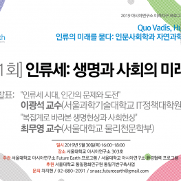 Speakers 최무영 교수 서울대학교 물리천문학부 이광석 교수 서울과학기술대학교 IT정책대학원 Start 2019년 5월 30일 - 4:00 pm End 2019년 5월 30일 - 6:00 pm Address 서울대학교 아시아연구소 303호 Categories 미래지구 프로그램 , 콜로키움 , 환경협력 프로그램 [1회] 인류세: 생명과 사회의 미래 “인류세 시대, 인간의 문제와 도전” 이광석 교수(서울과학기술대학교 IT정책대학원) “복잡계로 바라본 생명현상과 사회현상” 최무영 교수(서울대학교 물리천문학부) Photos + GOOGLE CALENDAR + ICAL IMPORT MORE DETAIL Website 02-880-2091 Email snuac.futureearth@gmail.com Related Events ‘비지니스맨이 바라본 미얀마의 정치와 경제’ 2014년 2월 17일 4:00 pm ‘아랍의 봄’ 이후 혁명과 반혁명 2018년 4월 12일 12:00 am