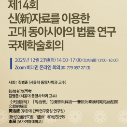 2025년 12월 23일, 오후 2시~5시에 걸쳐 ‘아시아의 지적가치 프로그램’ 주최 국제학술회의 <제14회 신(新)자료를 이용한 고대 동아시아의 법률 연구 국제학술회의>가 개최되었다. 본 국제학술회의는 진·한의 법률을 중심으로 고대 동아시아 법률의 원형을 복원하는 것을 목표로 하고 있다. 회의는 Zoom 라이브로 진행되었으며, 서울대·우한대·교토대 출신의 고대 동아시아사 연구자가 다수 참가하였다. 이번 회의에서는 김병준(서울대 동양사학과 교수), 黄浩波(우한대 간백연구중심 연구원), 李晟(오카야마대학 연구원) 3인이 발표하였다.