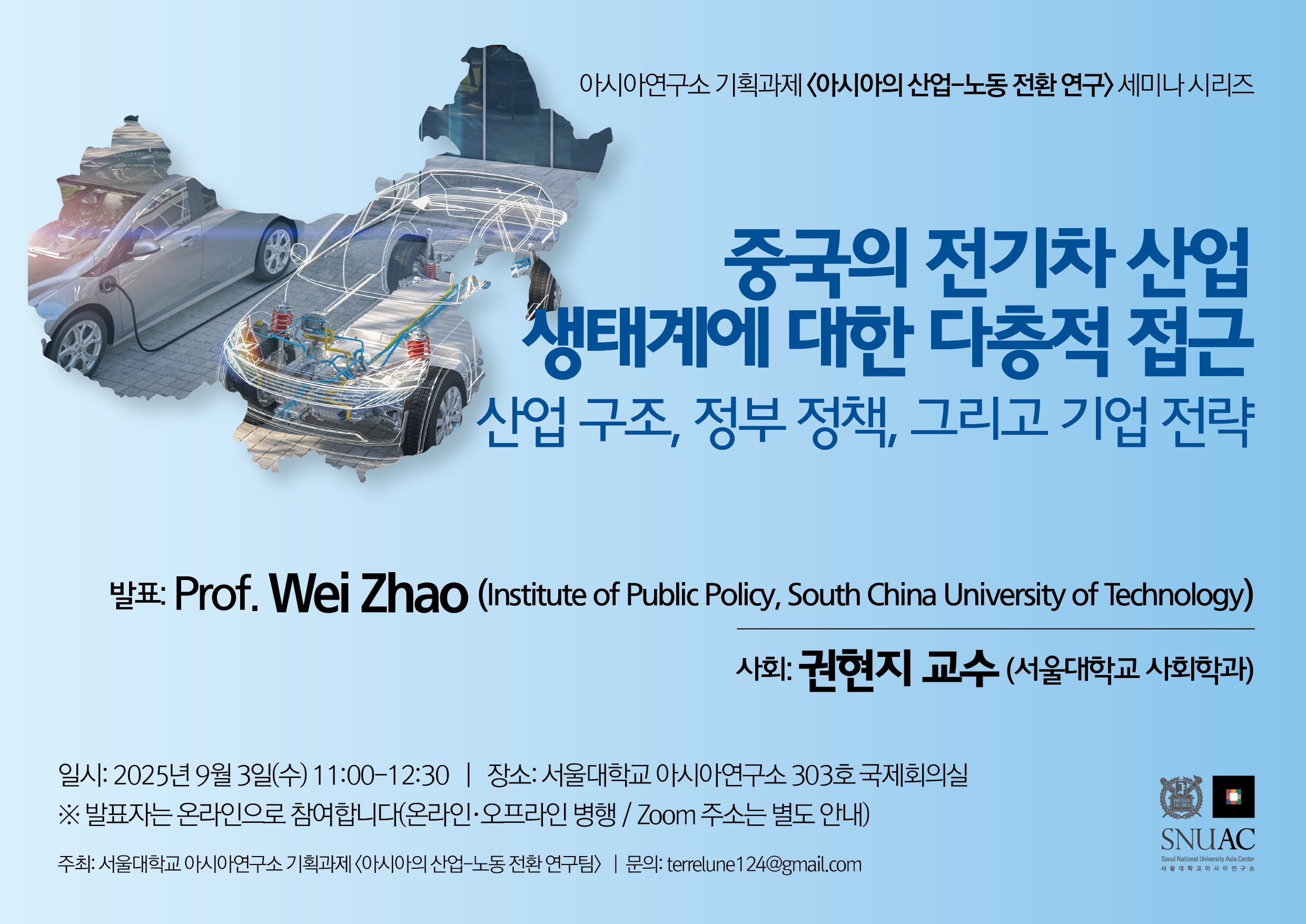 2025년 9월 3일, 아시아연구소 기획과제 <아시아의 산업-노동 전환 연구> 연구팀에서는 아시아의 EV 전환과 관련한 동아시아 국가들의 현황과 대응을 알아보기 위해 콜로퀴움을 진행하였다. 콜로퀴움에서는 Wei Zhao 교수( Institute of Public Policy, South China University of Technology)가 <중국의 전기차 산업 생태계에 대한 다층적 접금-산업 구조, 정부 정책, 그리고 기업 전략>(Industry Structure, Government Policy and Firm Strategy: An Multi-level Perspective of the EV Sector in China)을 주제로 발표하였다.