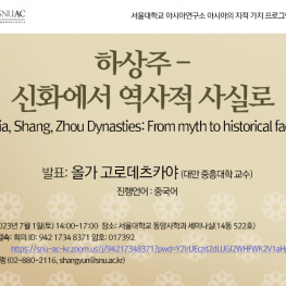 서울대학교 동양사학과 세미나실(14동 522호)<아시아의 지적 가치> 프로그램에서는 아시아의 중심 가치를 유가, 법가, 도가로 나누어 그 형성 과정을 중점적으로 살펴보고 있다. 동아시아에서는 춘추전국시대의 제자백가가 칼 야스퍼스가 말하는 축의 시대에 해당한다. 이 때 형성되는 많은 논의는 그 이전의 신화와 역사를 어떻게 기억하느냐에 따라 달라진다. 이번 대만 중흥대학의 郭靜云(올가 고로데츠카야)의 강연은 그 대상에 해당하는 하상주 시대를 <신화에서 역사적 사실로>라는 주제로 풀이한다. 이 강연을 통해 제자백가의 논의들이 어떻게 자신들의 이야기를 만들어갔는지를 점검할 수 있으리라 기대한다.
