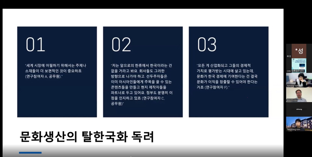 또한 김태영 교수는 한류 담론이 경제적 효용성을 넘어 국가주의적 상상력과 긴밀히 결합해 왔다는 점에 주목했다. 해외 시장에서의 성공은 콘텐츠의 ‘한국성’을 판단하는 새로운 기준으로 작동하며, 한류는 국가 브랜드와 국격을 상징하는 자원으로 반복적으로 호출되어 왔다. 그는 이러한 과정에서 문화의 자율성과 다양성이 어떻게 재구성되고 있는지를 질문하며, 한류의 지속 가능성을 비판적으로 성찰할 필요성을 제기했다.