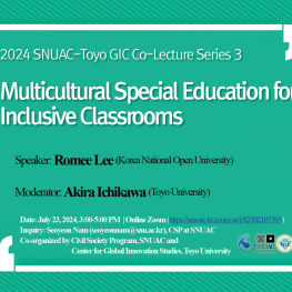 이번 워크숍은 2024 SNUAC-TOYO Co-Lecture 시리즈 세 번째 순서로 아시아연구소 시민사회 프로그램 이로미 공동연구원의 발표로 이루어졌으며, 사회 및 토론은 Toyo대 Akira Ichikawa 교수가 맡았다. 발표자는 이주민, 노인, 여성, 장애인 등, 다양한 성인학습자들의 삶, 그리고 그에 수반되는 교육과 학습에 관심을 두고 연구하며 공존과 포용의 사회를 지향한다.