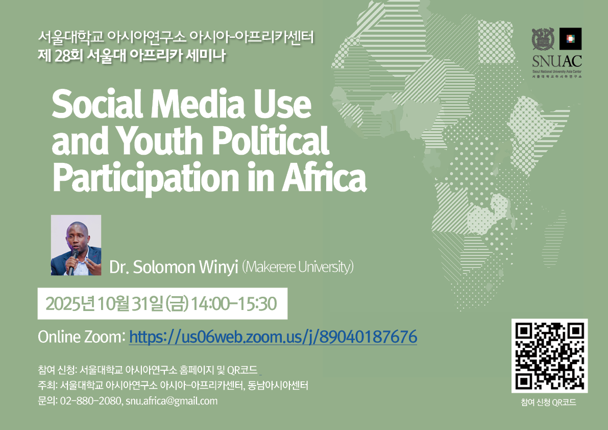 2025년 10월 31일(금)에 개최되는 제28회 서울대 아프리카 세미나에서는 우간다 마케레레대학교(Makerere University)의 솔로몬 윈이(Dr. Solomon Winyi) 교수를 초청하여 “Social Media Use and Youth Political Participation in Africa”를 주제로 강연이 진행된다. 이번 세미나에서는 아프리카 청년들이 정치적 참여의 장에서 소셜 미디어를 어떻게 활용하고 있는지를 분석하고, 디지털 플랫폼이 청년 정치 참여에 미치는 긍정적 효과와 잠재적 한계를 심도 있게 논의한다. 특히 온라인 공간이 전통적 정치 구조와 어떻게 상호작용하며 새로운 참여 형태를 만들어내는지를 조명함으로써, 참석자들은 아프리카 정치 과정에서 청년 세대의 역동성과 디지털 기술의 역할에 대한 폭넓은 이해를 얻을 수 있을 것이다.