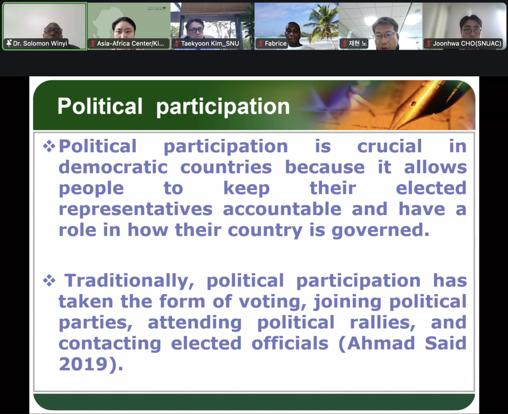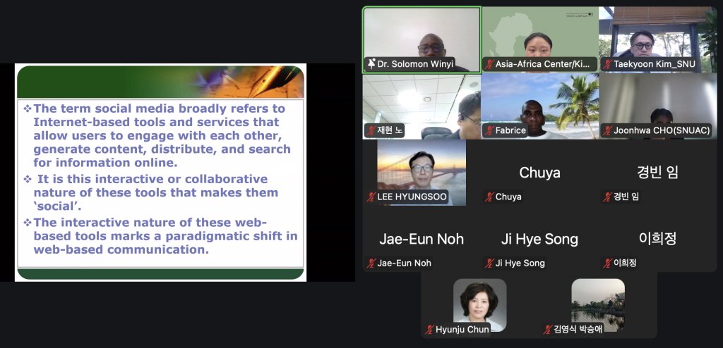 이번 강연은 아프리카 청년 세대가 소셜 미디어를 통해 정치 참여의 새로운 형태를 창출하고 있는 현상을 중심으로 진행되었다. 윈이 박사는 먼저 1990년대 세계은행·IMF의 구조조정정책에 따른 미디어 자유화 이후, 아프리카에서 라디오·TV 중심의 전통매체가 소셜 미디어로 확장되며 ‘디지털 공론장’이 형성되었다고 설명했다. 특히 하버마스의 공론장 이론을 적용하여, 과거의 토론장이 이제는 온라인상으로 이동함에 따라 시민들이 국경을 넘어 상호 연결되는 새로운 참여 구조가 등장했다고 분석하였다.